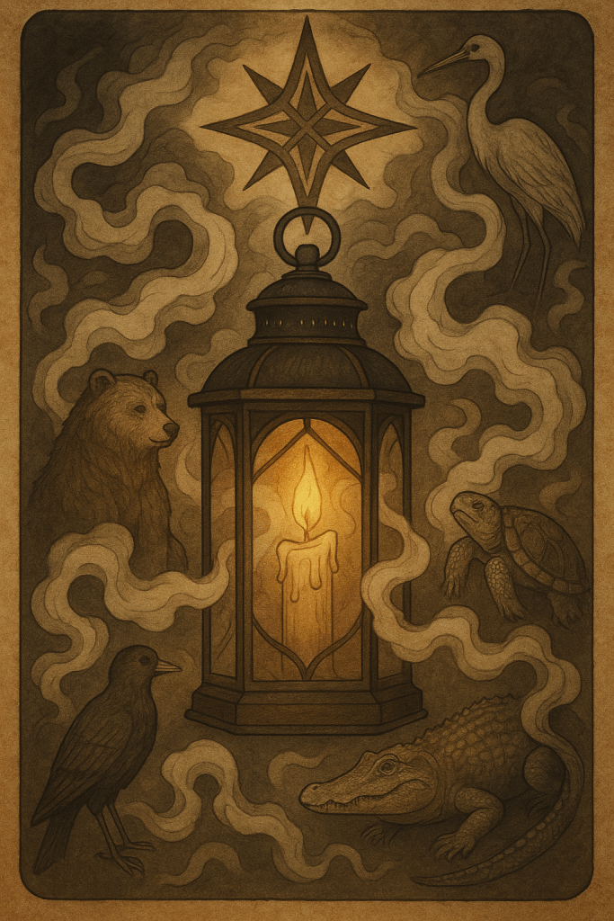 The Four Animal Spirits (Compass) โ Crane (East/Air), Turtle (North/Earth), Bear (West/Water), Alligator (South/Fire).